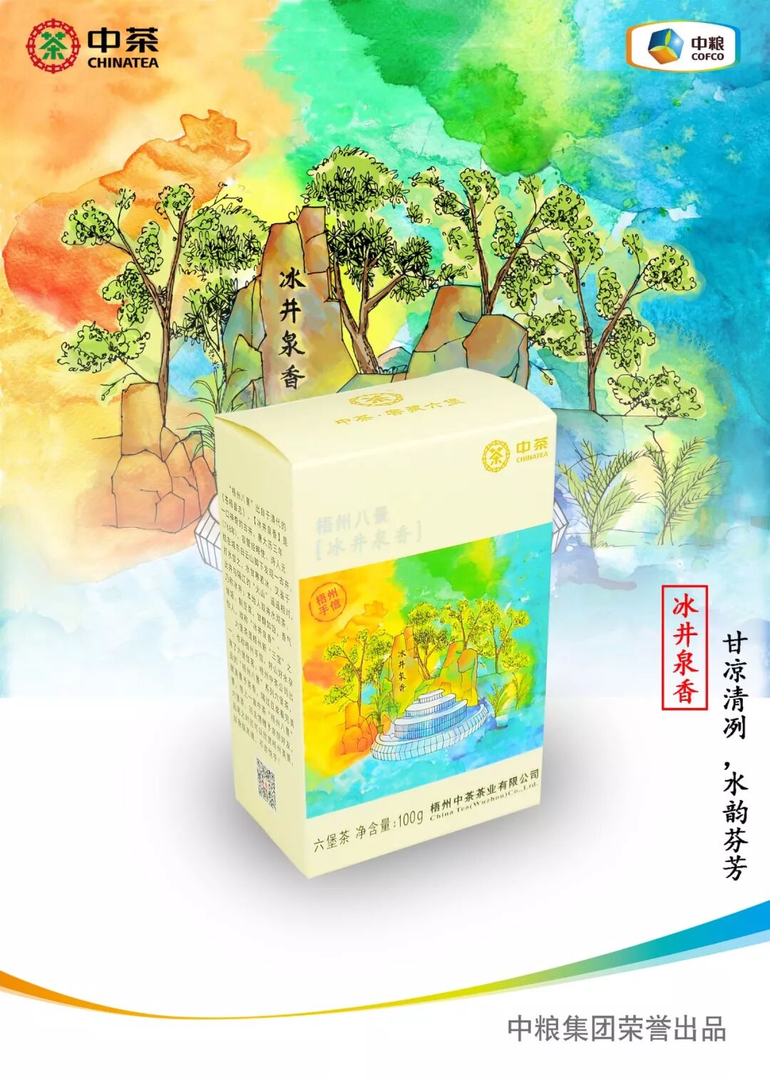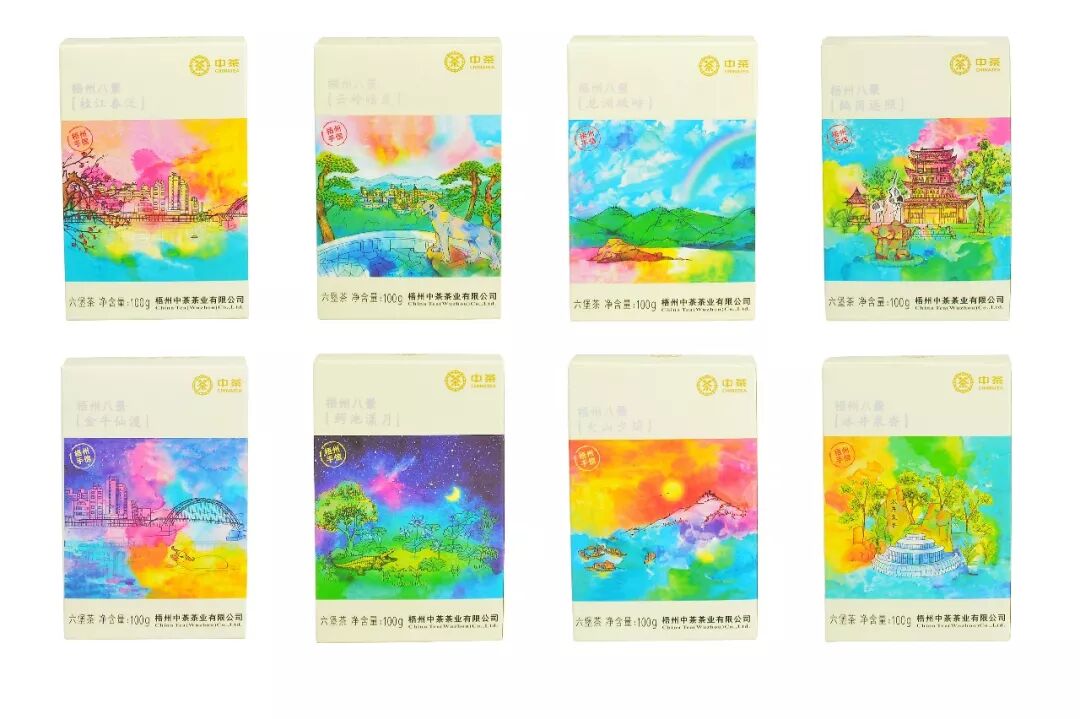 梧州中茶茶業(yè)有限公司出品的“梧州八景”手信系列,將著名的梧州八景與六堡茶結(jié)合,以茶為載體,以水彩畫形式表現(xiàn)梧州風(fēng)物,打造出一張真正屬于梧州的“新名片”——讓消費(fèi)者可以游梧州、喝六堡、賞八景,茶中有山水,山水育好茶。