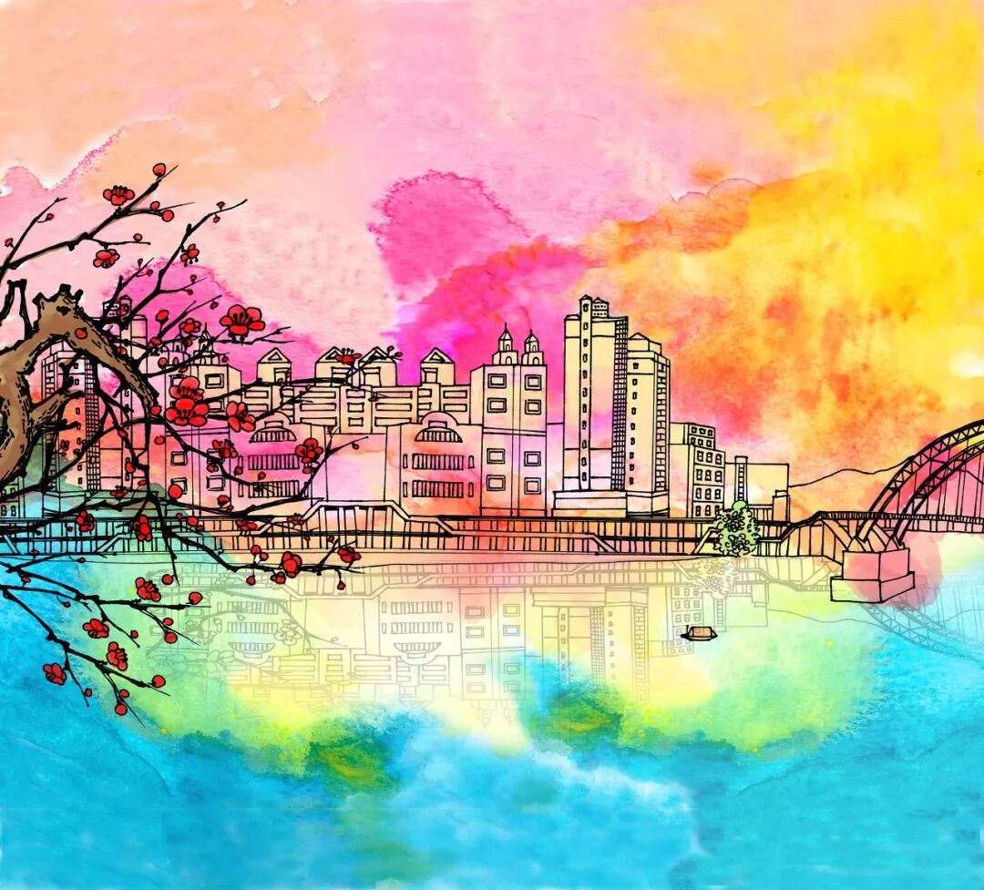 “桂江春泛”插圖將桂江兩岸的人文自然風(fēng)光悉數(shù)展現(xiàn)——桂江東岸高樓林立,鴛江大橋溝通東西兩岸,是梧州城市現(xiàn)代化建設(shè)的成果;一株木棉迎江盛開,桂江兩岸自然美景與城市風(fēng)貌相映成趣,美不勝收。