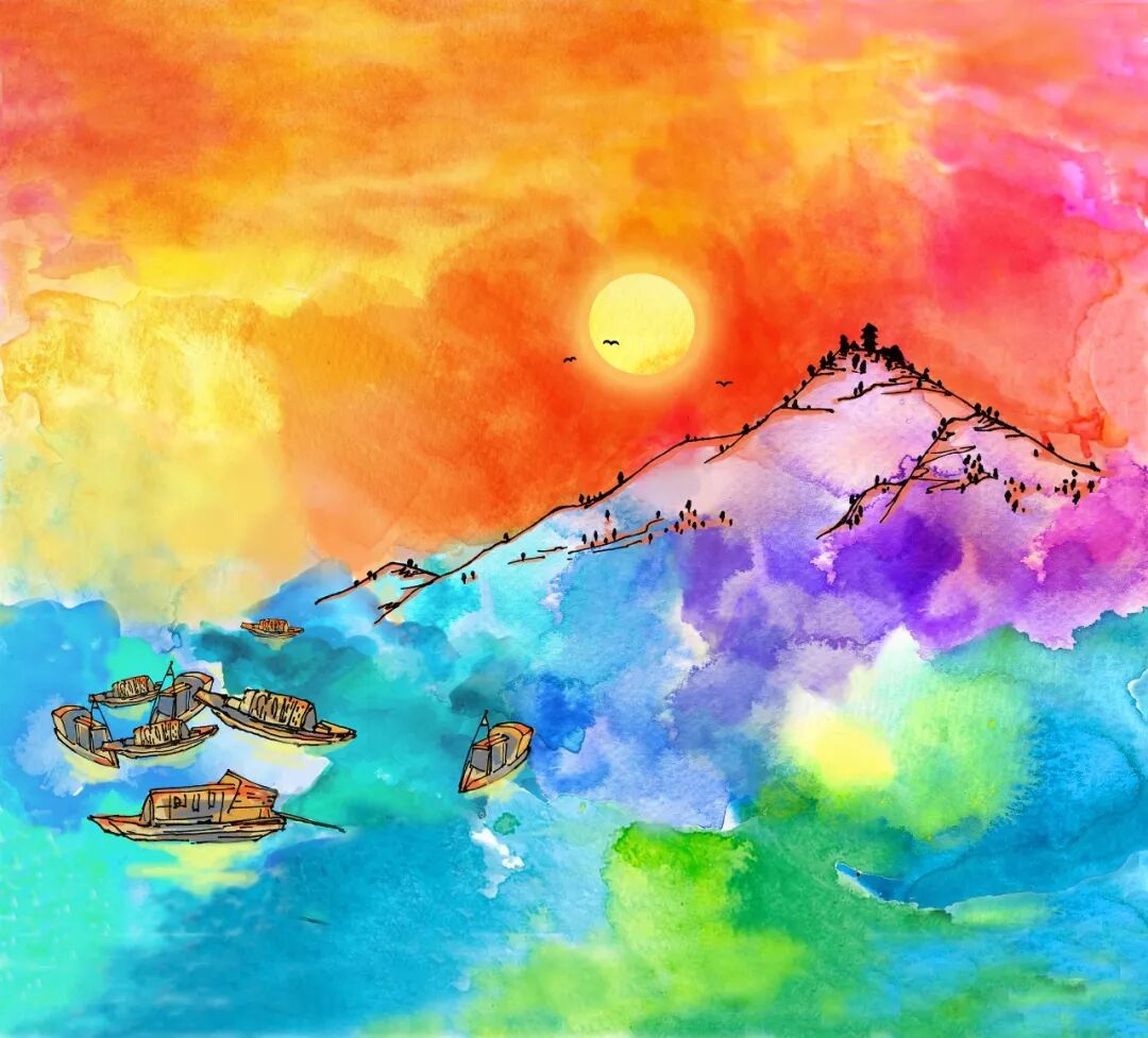 “火山夕焰”插圖描繪了“藏珠浮映夜輝山”的自然勝景,夕陽(yáng)映照下的南岸群山,紅光沖天;山前是奔騰流淌的“黃金水道”,漁船搖曳在江中,一幅“漁舟唱晚”的景象展現(xiàn)了出來(lái)。