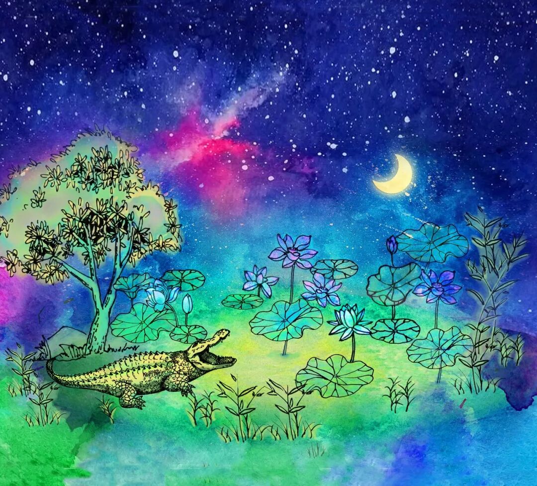 “鱷池漾月”一畫中,描繪的是水潭中鱷魚夜出的景象——夜空下,月照荷塘,嘉魚攬?jiān)拢哂幸环撵o深邃的別樣趣致。