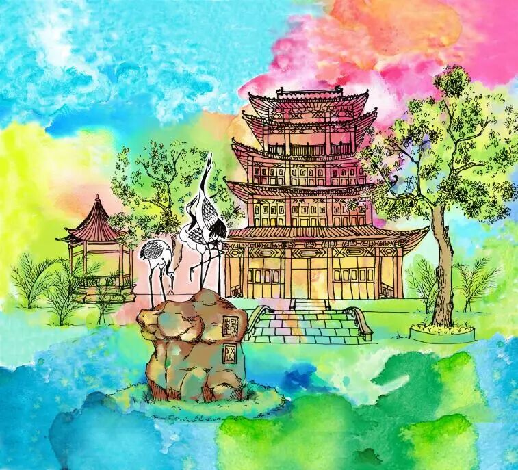 “鶴崗返照插畫中,栩栩如生的白鶴雕像矗立在鶴崗樓前,在五光十色的霞光映照下,白鶴、樓宇、山光相容相諧,飛鶴投林的景象躍然紙上。
