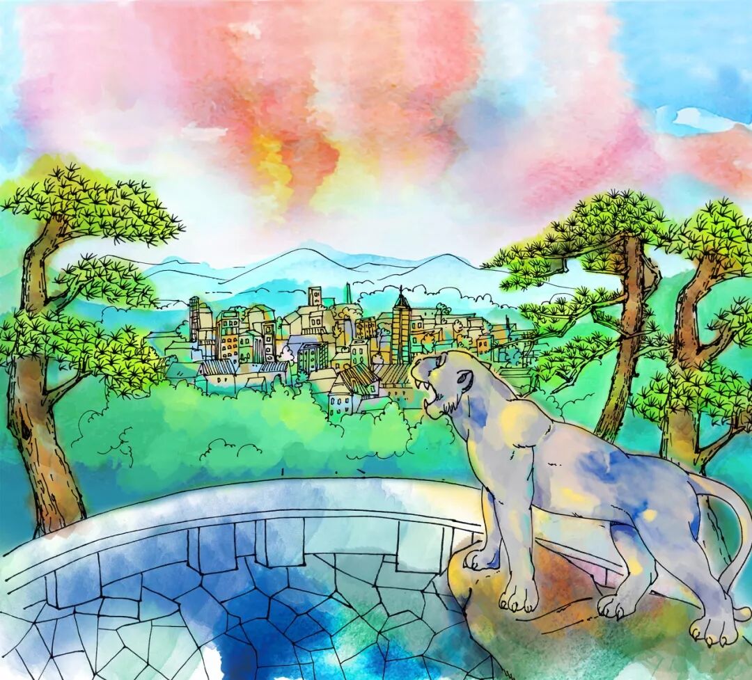 云嶺晴嵐的插畫取景于梧州白云山北麓的“伏虎巖”,氣勢(shì)磅礴的猛虎雕像眺目遠(yuǎn)望;遠(yuǎn)處,梧州市區(qū)上空縈繞著斑斕的霧氣,展現(xiàn)出了城市與自然和諧共存的景象。
