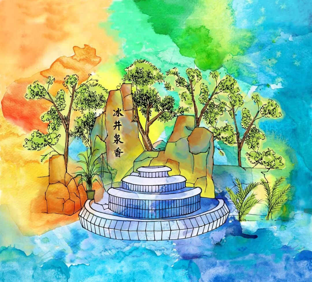 “冰井香泉”插畫中,清澈剔透的泉水從泉眼中涓涓而流,由古至今,芬芳的水韻未曾斷流;如今,泉眼周圍立起瓷磚砌的階梯,立起了石碑,將這一梧州瑰寶保護(hù)起來(lái),將梧州的山水保護(hù)起來(lái)。