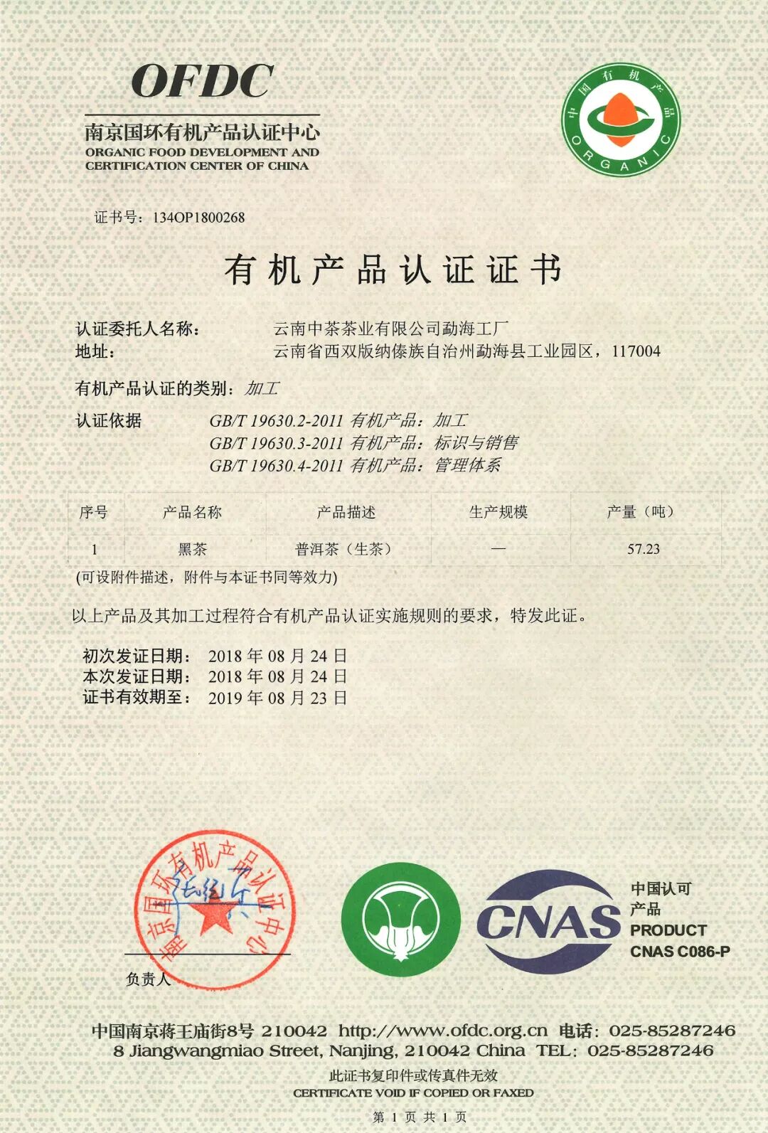 中茶有機(jī)普洱茶(生茶)的原料、生產(chǎn)等環(huán)節(jié)嚴(yán)格遵循有機(jī)食品標(biāo)準(zhǔn),建立了嚴(yán)格的質(zhì)量管理體系、生產(chǎn)過程控制體系和追蹤體系。