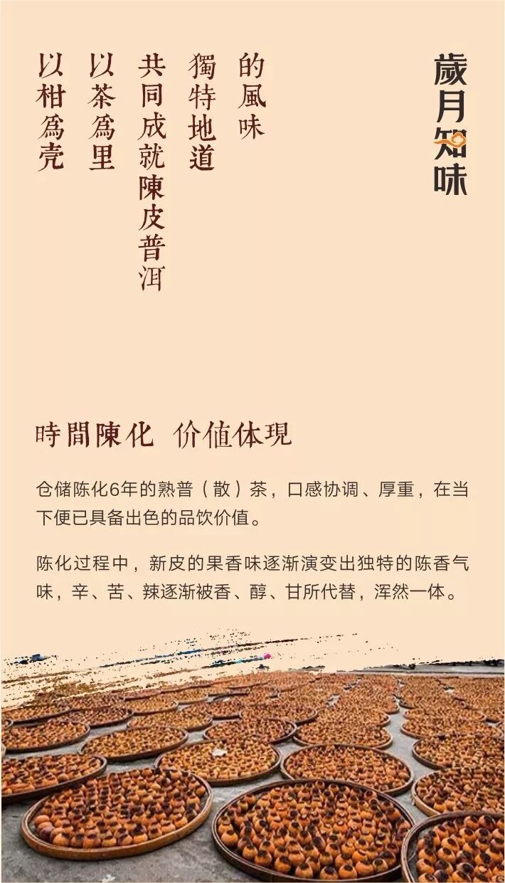 一款好的陳皮普洱,必須經(jīng)過(guò)好的原料、工藝、倉(cāng)儲(chǔ)、環(huán)環(huán)相扣才會(huì)造就純正口感。而這一切除了人為因素外,還有就是漫長(zhǎng)時(shí)間的自然陳化。