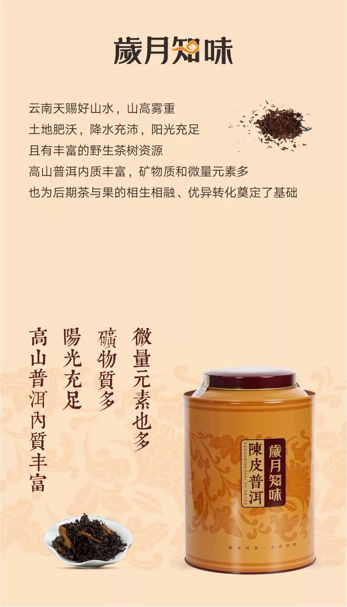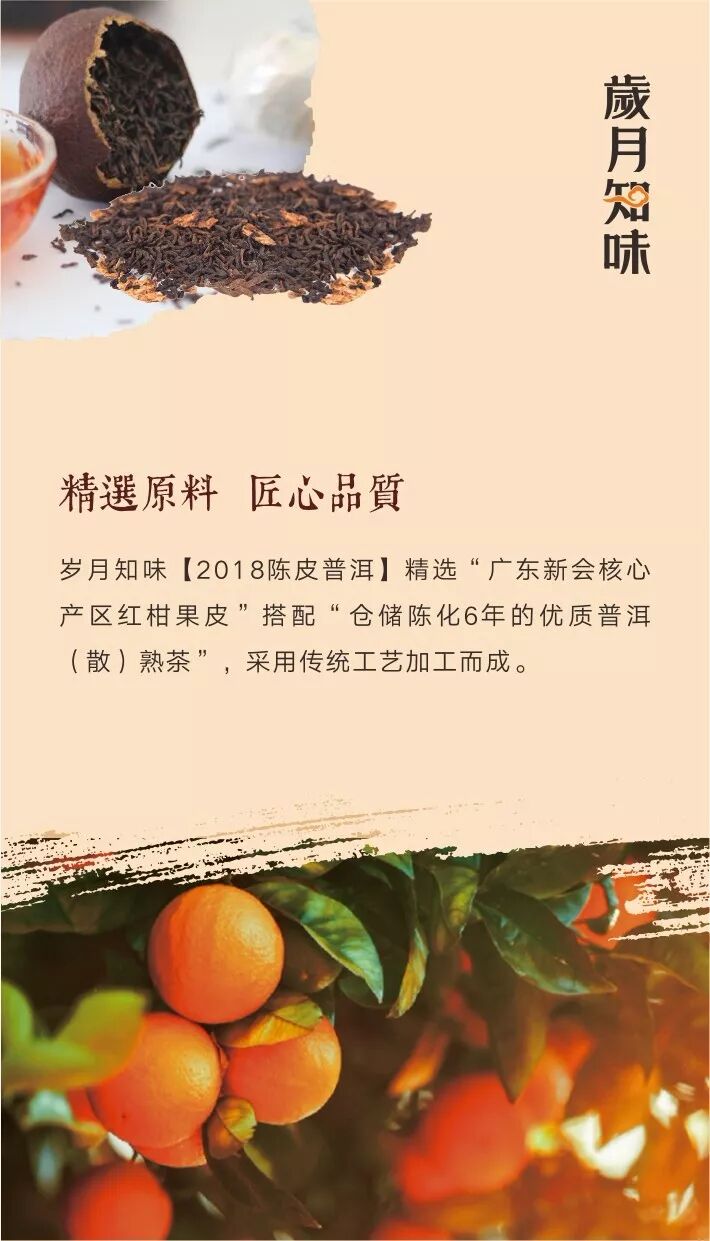 歲月知味【2018陳皮普洱】精選“廣東新會(huì)核心產(chǎn)區(qū)紅柑果皮”搭配“倉(cāng)儲(chǔ)陳化6年的優(yōu)質(zhì)普洱(散)熟茶”,采用傳統(tǒng)工藝加工而成。