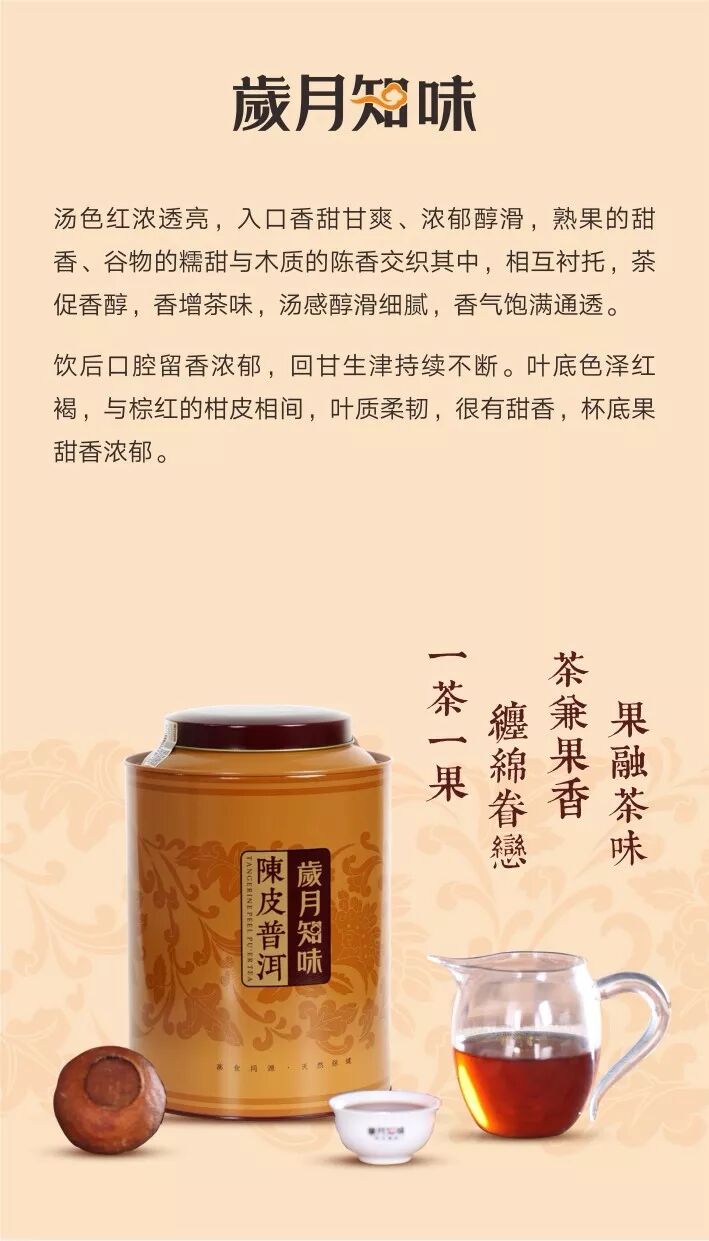 歲月知味獨(dú)特的配制工藝,令茶湯融合了新會(huì)陳皮清醇芬芳的果香與云南普洱茶醇厚甘潤(rùn)的茶香,濃郁的花果香與醇和的陳香相互吸收,糅合交融。