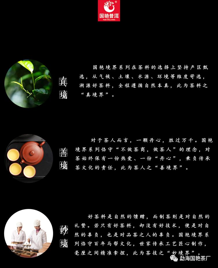 【國艷境界系列】是由西雙版納勐海國艷茶廠董事長——董國艷女士親率研究小組深入茶山,對西雙版納境內(nèi)各古茶山進行實地考察,收集第一手資料,為原料的采集、制作工藝的確定奠定了基礎。經(jīng)過近5年的努力,“國艷境界”系列古樹純料普洱茶在馬來西亞、臺灣、澳門、香港以及資深茶人及專家的支持下,于2008年隆重推出這款極具飲用價值和收藏價值的古樹純料普洱茶。