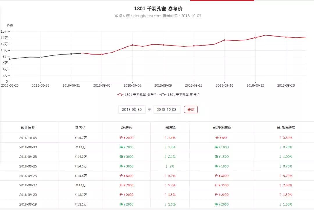 2、大益茶新品“千羽孔雀”,42片/件,從8月13日開始期貨炒作,開盤價28050元/件,只漲不跌,一路漲到150000元/件,官方公布全國數(shù)據(jù)5500件,開盤市值1.54億元,目前炒作市值8.2億元。