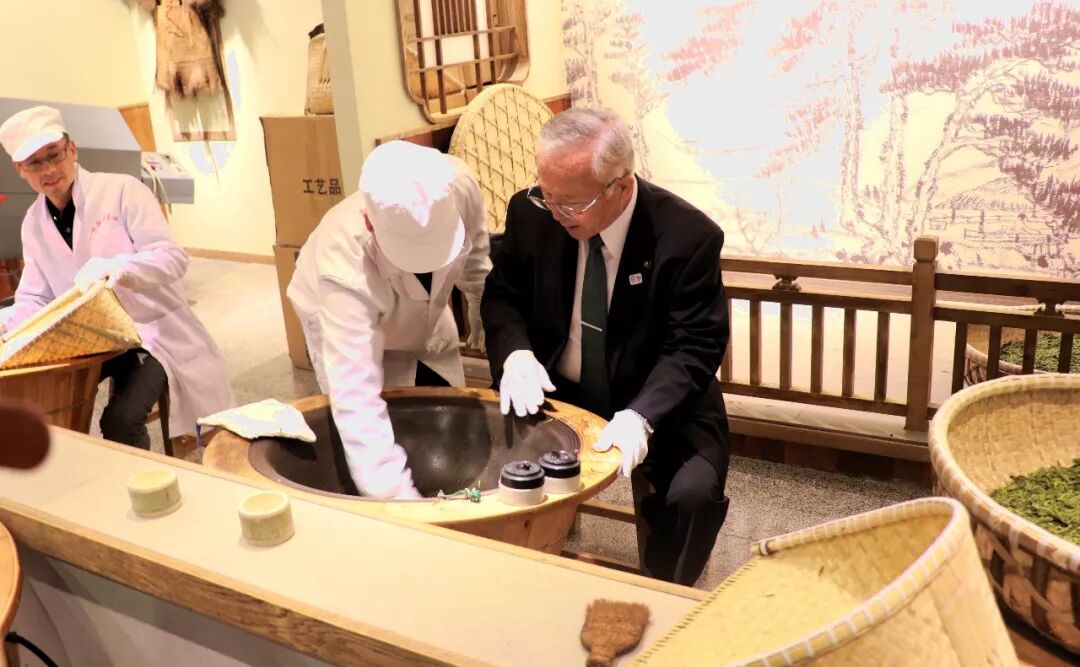 之后代表團(tuán)來(lái)到了萬(wàn)融堂,參觀了手工制茶工藝與生產(chǎn)流水線,牧之原市市長(zhǎng)杉本基久雄親自體驗(yàn)了鐵鍋炒茶。