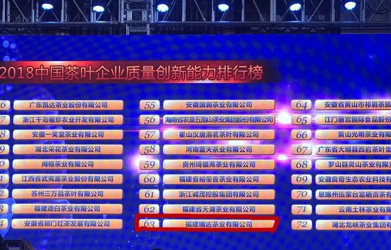 會上也公布了這是質(zhì)量創(chuàng)新能力排行榜,福建瑞達(dá)茶業(yè)有限公司赫然在榜
