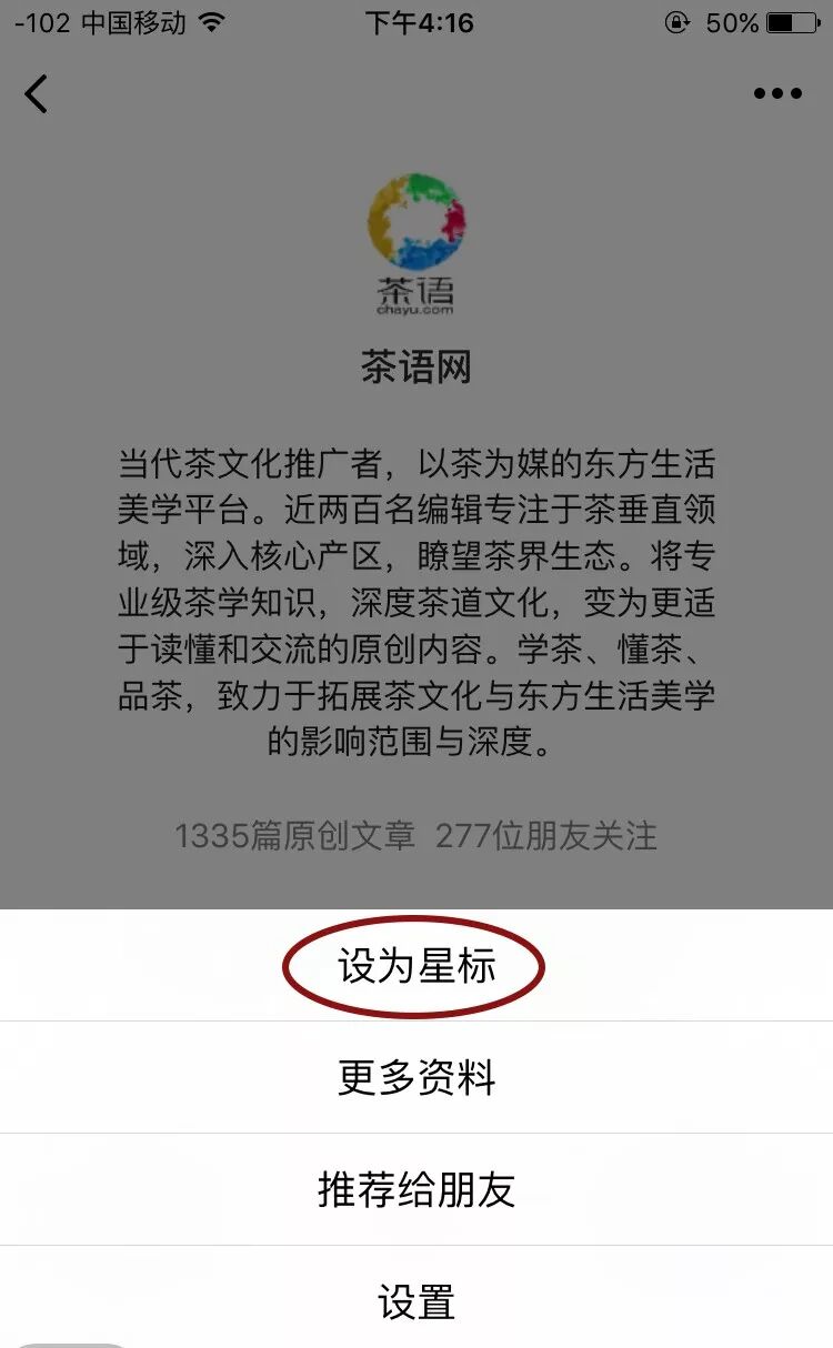 衷心感謝各位茶友長久以來對茶語網微信公眾號的支持,為了能讓您第一時間就看到茶語網的好文推送,我們建議您將茶語網微信公眾號設為星標公眾號。具體操作為在茶語網微信主頁面點擊右上角后,再點擊“設為星標”,您以后就能第一時間找到我們啦!