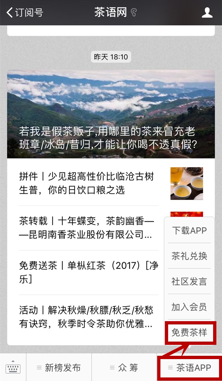 首先呢,你得先關注微信公眾號“茶語網(zgcybtea)”;其次呢,你得點到茶語網的下拉菜單頁面;最后呢,點出右下角的“茶語APP”菜單,接著再點擊進入“免費茶樣”頁面。