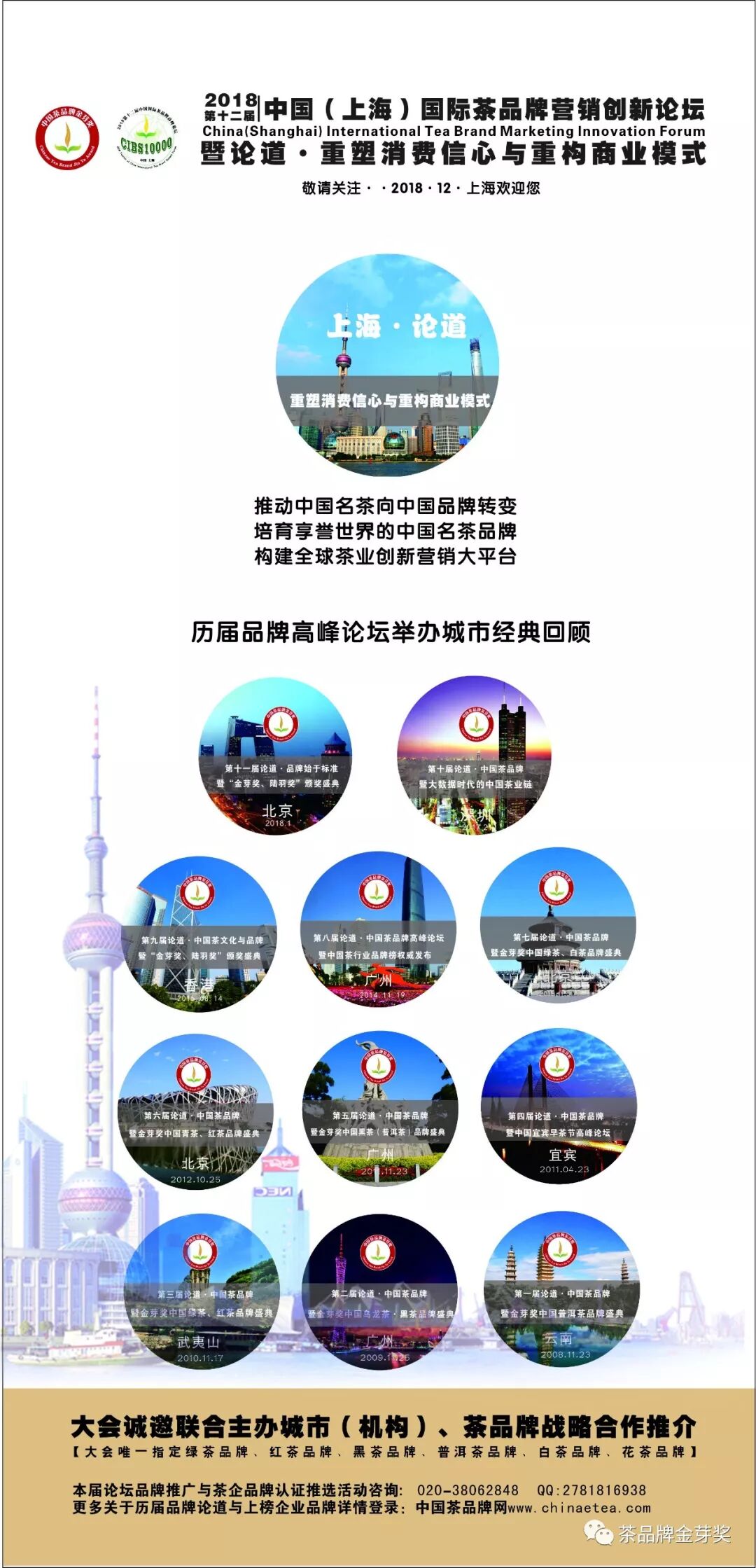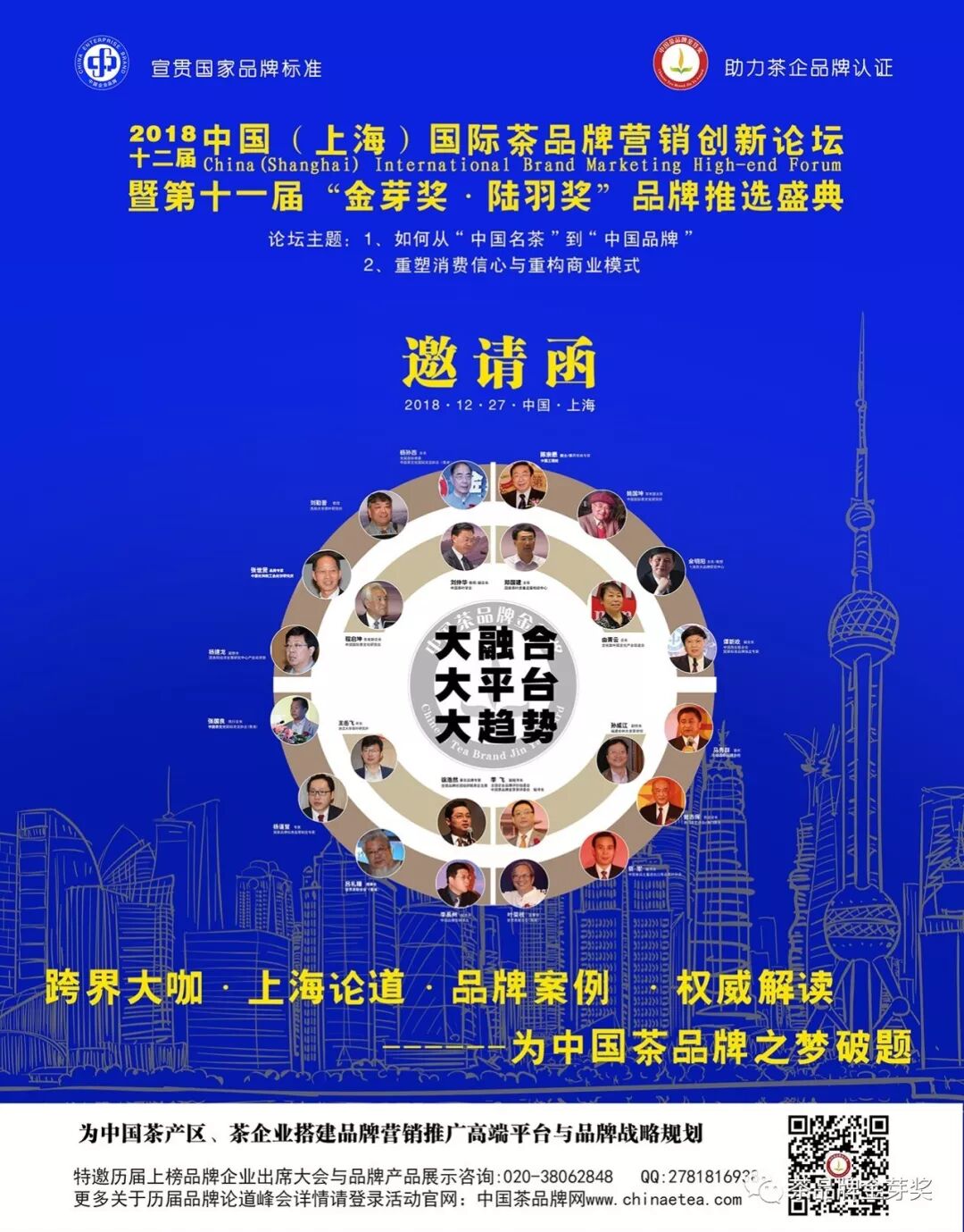 第十二屆“論道•中國茶品牌”上海高端論壇與第十一屆“金芽獎•陸羽獎”品牌推選盛典于12月26-27日在上海盛大舉行。本次論壇以“重塑茶葉消費信心與重構(gòu)茶業(yè)商業(yè)模式”為主題,大會將匯聚跨界更高端、更前沿的頂級智庫、品牌大咖、茶界權(quán)威專家、投融財團、品牌企業(yè)、創(chuàng)新案例,全方位論道當前中國茶行業(yè)的創(chuàng)新商業(yè)模式和品牌標準管理體系的新思路,為中國茶產(chǎn)業(yè)打造品牌國際化之路尋求新路徑。同時也是凝聚中國茶企業(yè)家創(chuàng)新精神,展示中國茶企業(yè)品牌典范的商業(yè)頂級盛會與高端推介平臺。