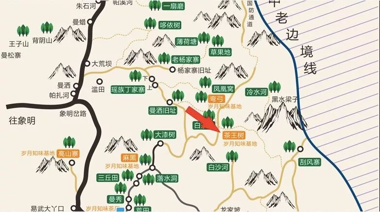 而這三條口味帶的中心,便是茶王樹,在無論是我個人抑或是歲月知味,甚至是茶友們的認知中,茶王樹是真正具備了花香、蜜香、原野香幾種特質(zhì)的區(qū)域,所以我們說,茶王樹其實是易武口感協(xié)調(diào)度最高的區(qū)域。