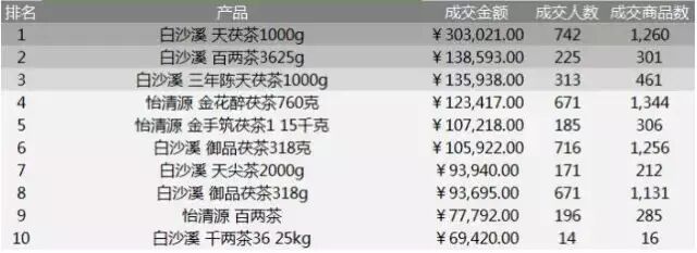白沙溪和怡清源這兩個傳統(tǒng)黑茶品牌茶企,瓜分了黑茶類單品成交的top10。白沙溪獨占7席。