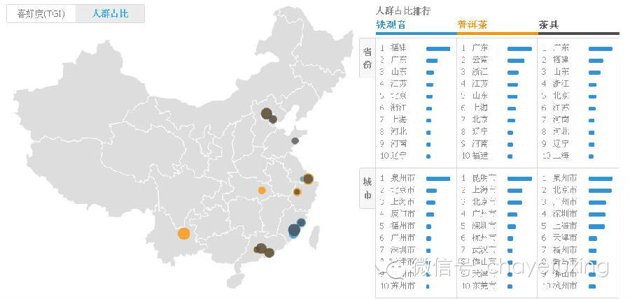 對(duì)于茶產(chǎn)品消費(fèi)主要還是集中在沿海地帶,與經(jīng)濟(jì)水平有直接關(guān)系。昆明位列普洱茶人群占比第一,泉州位列鐵觀音人群占比第一說(shuō)明集散地和原產(chǎn)地同時(shí)也是重要的消費(fèi)區(qū)。但廣東依然是普洱茶人群占比最大的省份。