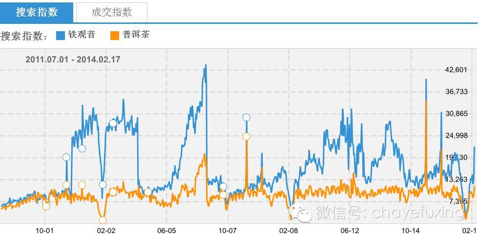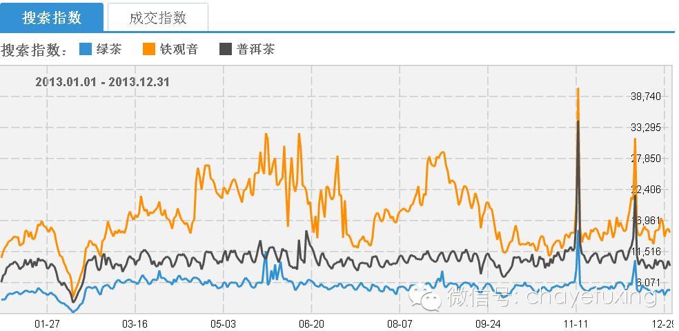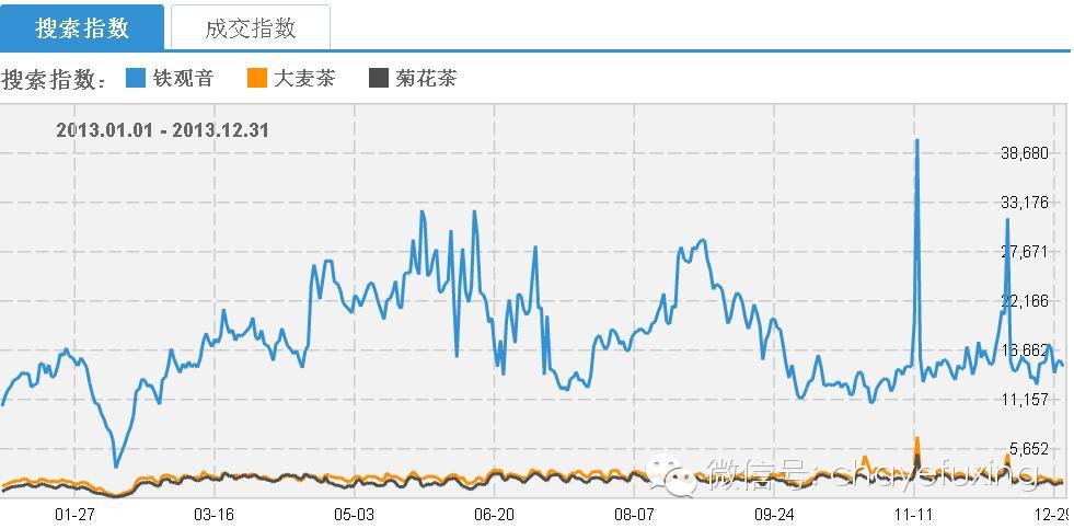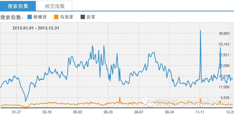 從圖上不難發(fā)現(xiàn),在淘寶指數(shù)中,鐵觀音無(wú)疑是龍頭老大,全年搜索指數(shù)覆蓋其它所有茶類。