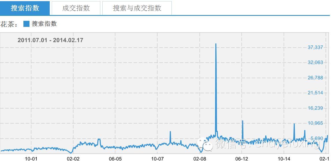 至于紅茶,金駿眉幾乎就成了紅茶的代言,二者的搜索指數(shù)大幅重合,猜測(cè)金駿眉貢獻(xiàn)了紅茶的大部分?jǐn)?shù)據(jù),但是其它紅茶的所占比例也就相應(yīng)被壓縮得很低。