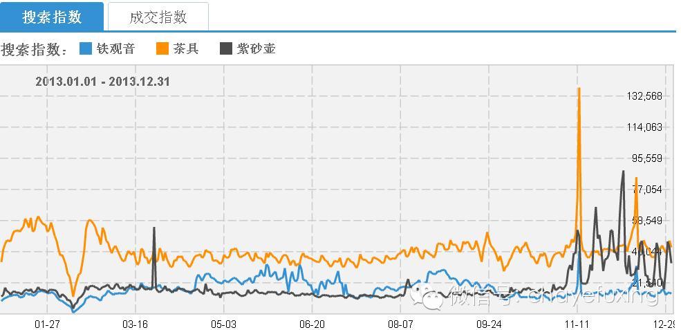 和茶具相比,所有的茶都弱爆了。單單一個(gè)紫砂壺,其搜索指數(shù)就已經(jīng)略勝過(guò)鐵觀音了,而茶具的搜索指數(shù)是鐵觀音的兩倍以上。