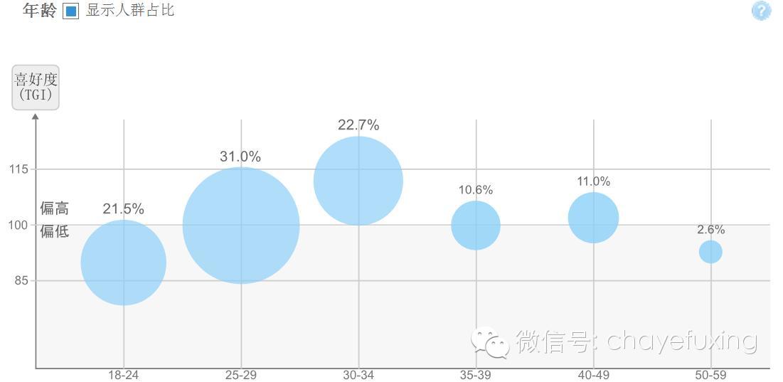 相比普洱茶人群,鐵觀音人群就年輕得多了。30-34歲人群特別喜愛鐵觀音,而其它年齡段都不突出。
