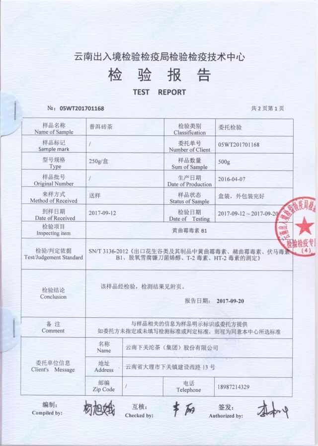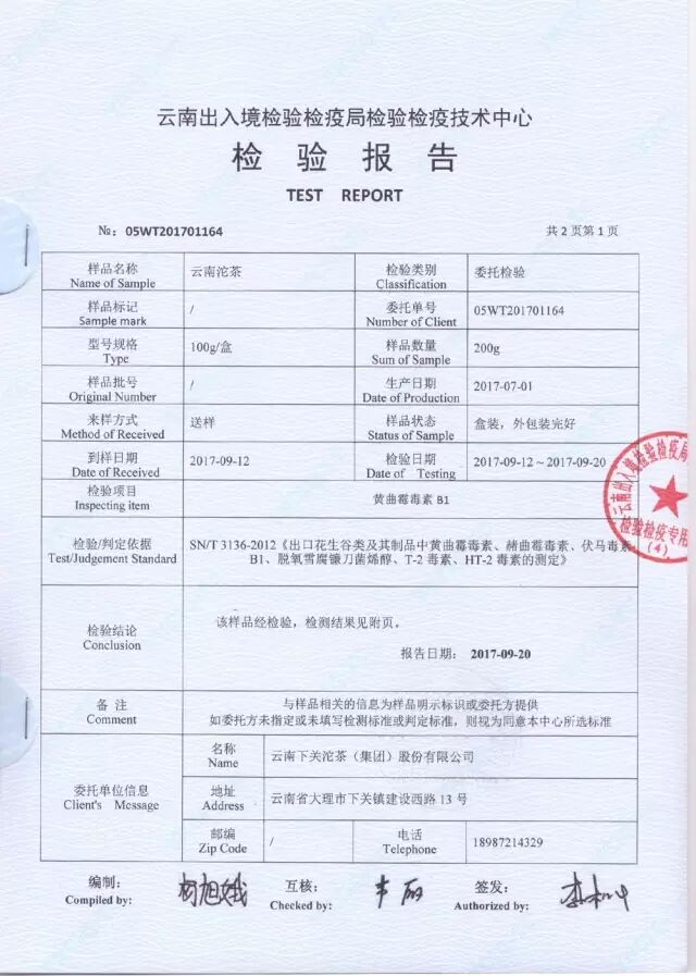 2017年100克云南沱茶檢驗(yàn)報(bào)告