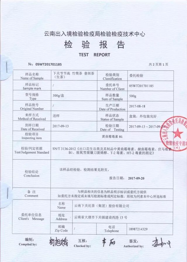 2017年500克下關(guān)節(jié)節(jié)高竹筒茶檢驗(yàn)報(bào)告