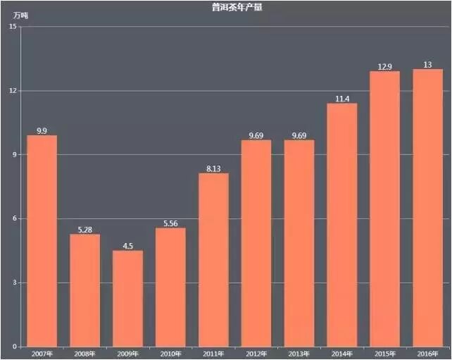 從這一組十年的數(shù)據(jù)可見(jiàn):2007年普洱茶產(chǎn)量達(dá)到過(guò)一個(gè)峰值,2008年發(fā)生大幅回落,一直到2011年持續(xù)年產(chǎn)量都在5萬(wàn)噸左右浮動(dòng)。2012年開(kāi)始,產(chǎn)量大幅回增,且逐年增長(zhǎng),2016年已達(dá)到13萬(wàn)噸。