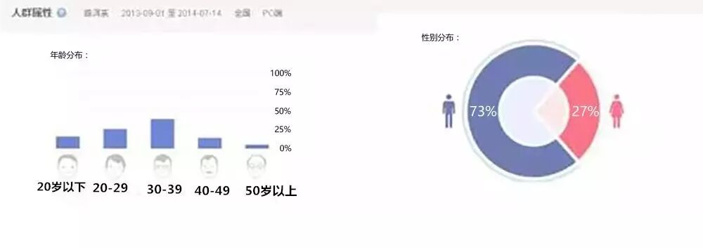 關(guān)注普洱茶的人群中男性所占比重明顯高于女性,年齡段分布在30-39歲的人群幾乎占據(jù)了一半。