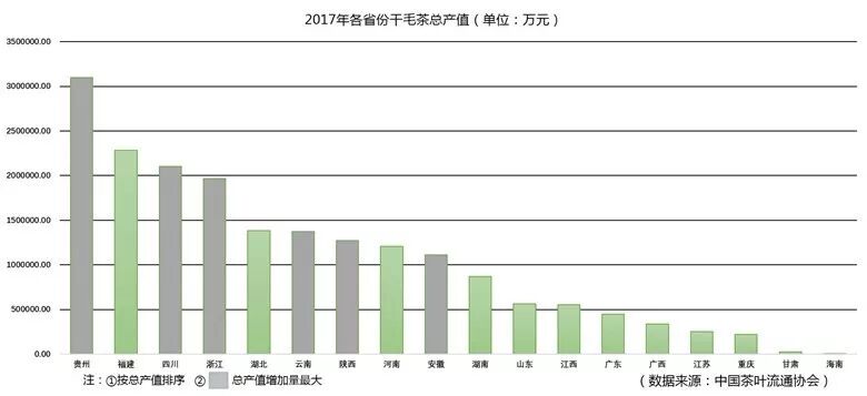 農(nóng)業(yè)產(chǎn)值明顯提升。全國(guó)干毛茶總產(chǎn)值達(dá)到1907.6億元,比上年增加225.6億元,增幅13.4%。干毛茶產(chǎn)值逾百億元的省份達(dá)九個(gè),位居前四位的是貴州、福建、四川、浙江,增長(zhǎng)額居前的省份是貴州、安徽、浙江、四川、云南、陜西。