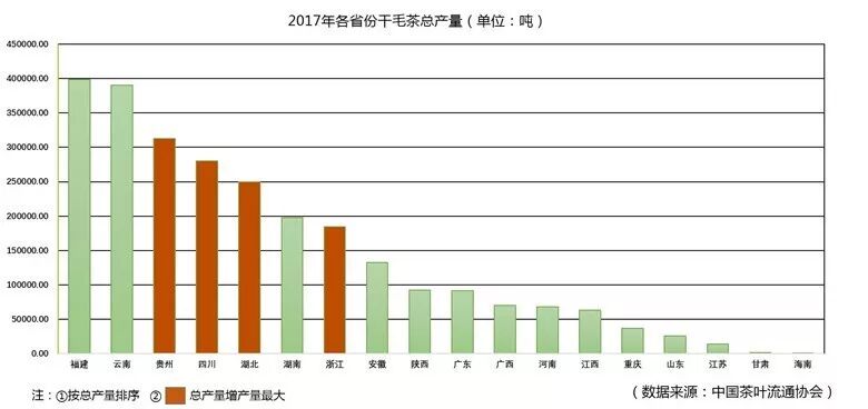 總產(chǎn)量持續(xù)增加。全國(guó)干毛茶產(chǎn)量為260.9萬噸,比上年增加16.9萬噸,增幅6.1%。產(chǎn)量超過20萬噸的省份是福建、云南、貴州、四川、湖北;增產(chǎn)逾萬噸的省份有九個(gè),前四位分別是貴州、四川、湖北、浙江。