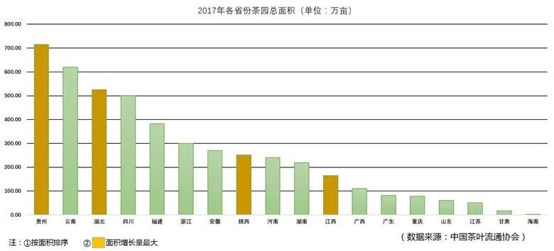 總面積保持緩增。據(jù)調(diào)查,2017年全國(guó)18個(gè)產(chǎn)茶?。▍^(qū))茶園面積總面積4588.7萬畝,比上年增加近135萬畝。面積最大的五個(gè)省份是貴州、云南、四川、湖北、福建,面積增加較多的省份是湖北、貴州、陜西、江西。