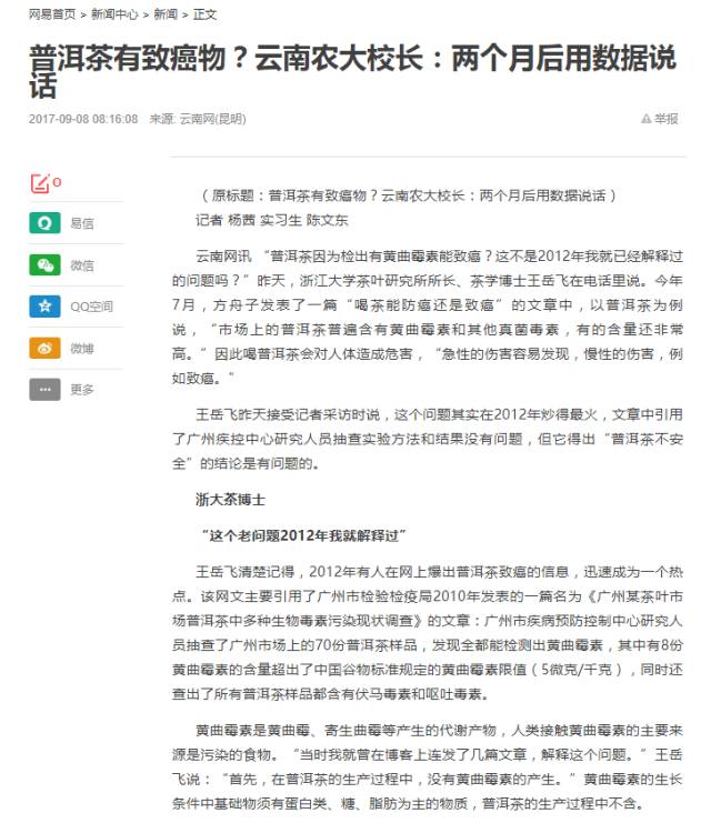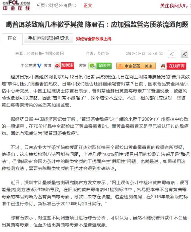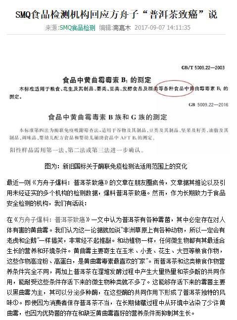 2017年9月7日深圳市計(jì)量質(zhì)量檢測研究院食品檢測所:普洱茶的特點(diǎn)抑制黃曲霉素生長--查閱文獻(xiàn)未見普洱茶中分離出黃曲霉素的報(bào)道--該所每年檢測黃曲霉素的樣品超過1.5萬批次--2008年摸底檢測茶葉中未檢出黃曲霉素B1--舊版國標(biāo)檢測方法存在漏洞。云南農(nóng)業(yè)大學(xué)茶學(xué)院教授周紅杰在接受經(jīng)濟(jì)日報(bào)采訪時(shí)也質(zhì)疑了檢測方法。