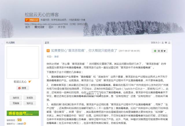 2017年9月6日科學(xué)松鼠會(huì)作者云無心的批判如下:真正品質(zhì)優(yōu)良的普洱茶幾乎不可能有黃曲霉素--檢測出黃曲霉素的是濕倉普洱茶--即使有按檢出結(jié)果也微不足道——品質(zhì)優(yōu)良的普洱茶不會(huì)致癌。
