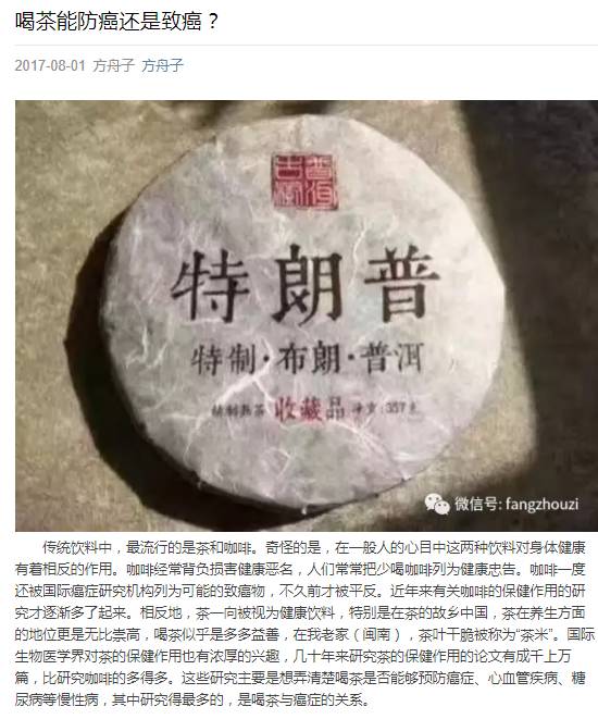 2017年8月1日方舟子文章邏輯:黃曲霉素是強(qiáng)烈致癌物--普洱茶儲(chǔ)存過程可能造成黃曲霉素污染--普洱茶曾被檢出黃曲霉素超標(biāo)--曾有造成急性中毒的案例--常人無法辨別普洱茶中是否含有黃曲霉素--普洱茶有致癌風(fēng)險(xiǎn)。