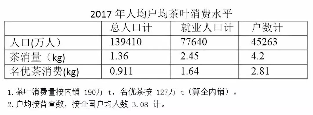 根據(jù) 2017 年的人口數(shù)據(jù)及茶葉內(nèi)銷數(shù)據(jù),可以看出,按總?cè)丝趤硭闳司枞~消費(fèi)量到了 1.36 kg,按就業(yè)人口來算人均已經(jīng)達(dá)到 2.45 kg,按戶均計(jì)算則高達(dá) 4.2 kg。所以說目前的茶葉內(nèi)銷已經(jīng)到了很高的一個(gè)水平,再要繼續(xù)高增長似乎存在一定困難。