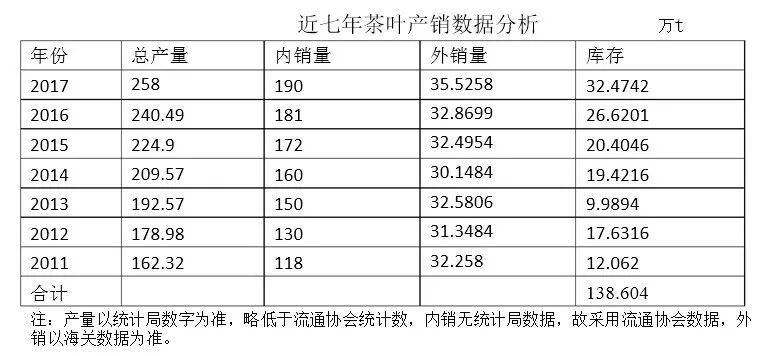 從表中官方數(shù)據(jù)可知:茶葉產(chǎn)量從 2011 年 162 萬 t 增加到 2017 年的 258 萬 t,接近增加100萬 t。內(nèi)銷增加約 70 萬 t,外銷基本持平,所以 2017 年茶葉的庫存約 30 萬 t 。同樣分析可知 2011 年到 2017 年累積的茶葉庫存已經(jīng)達(dá)到約 138 萬 t?。這些庫存茶葉應(yīng)該是留在茶葉生產(chǎn)企業(yè)手中的茶,而不包括經(jīng)銷商手中的茶葉(紅茶、黑茶、白茶)。按目前的生產(chǎn)水平,現(xiàn)有的茶園在未來3年全部投產(chǎn),屆時(shí)茶葉產(chǎn)量將達(dá)到 300 萬 t?以上。而由于內(nèi)銷增長的遲緩,外銷的困境,每年的庫存會(huì)以更高的比例增加,至少會(huì)以不低于30萬 t 的速度增長,因此 2020年,茶葉庫存突破 200 萬 t?是可預(yù)期的。如果沒有找到新的茶葉出路,如茶葉的外銷,茶葉的另類用途等,茶葉產(chǎn)大于銷的局面會(huì)越來越嚴(yán)重。最后茶園將會(huì)以更快速度拋荒。