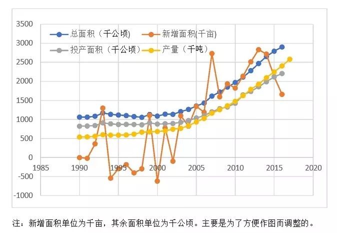 這幾年中國快速發(fā)展茶產(chǎn)業(yè),面積產(chǎn)量急劇增加。目前茶葉面積產(chǎn)量都居于世界第一。面積產(chǎn)量的急增起始于 2003 年前后,產(chǎn)量面積都是同步急增的,這個(gè)直線增加的勢頭一直延續(xù)到現(xiàn)在才有所緩和,即 2017 年全國新增面積開始回落。但也可能是回調(diào),2018 年仍可能恢復(fù)。