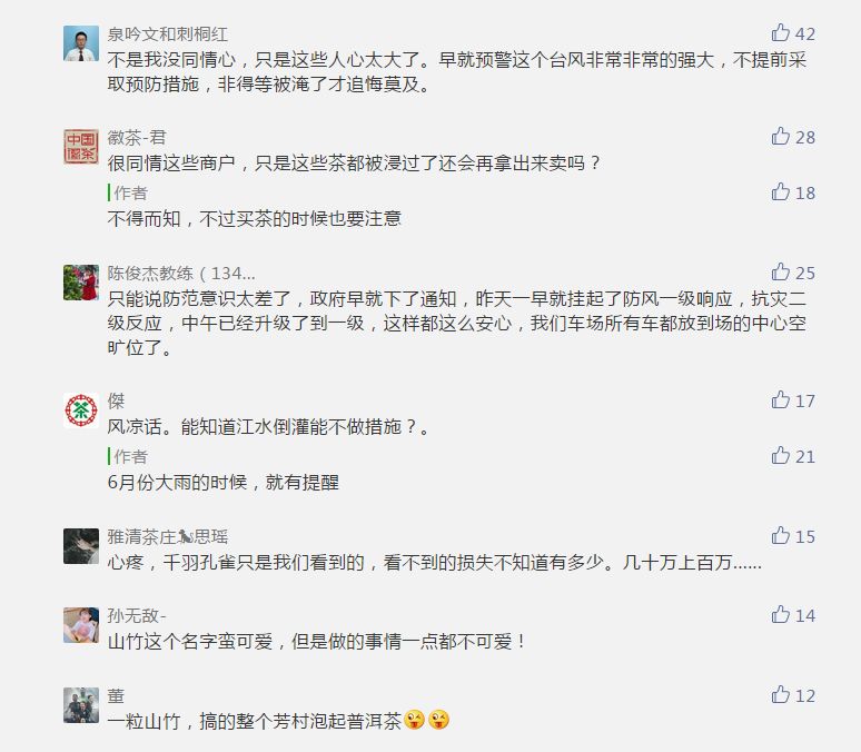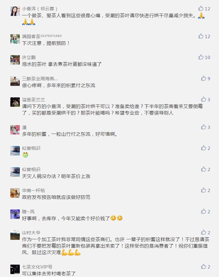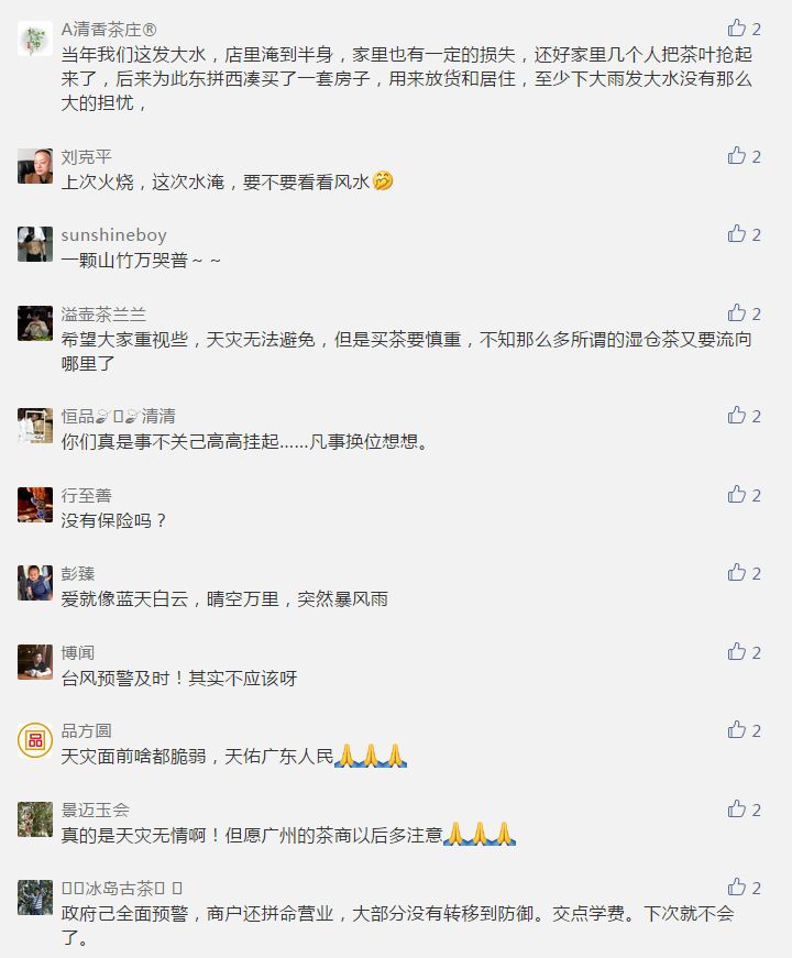 有茶友說:又可以去芳村喝好茶了;茶友還擔心那些受潮的茶葉是否又會流入市場,賣給其他不懂茶的消費者;還有很多人認為,既然廣州是個那么容易受臺風影響的地方,那為什么給出了那么多的紅色預(yù)警,茶葉市場卻還是逃脫不了這次“山竹”的厄運?