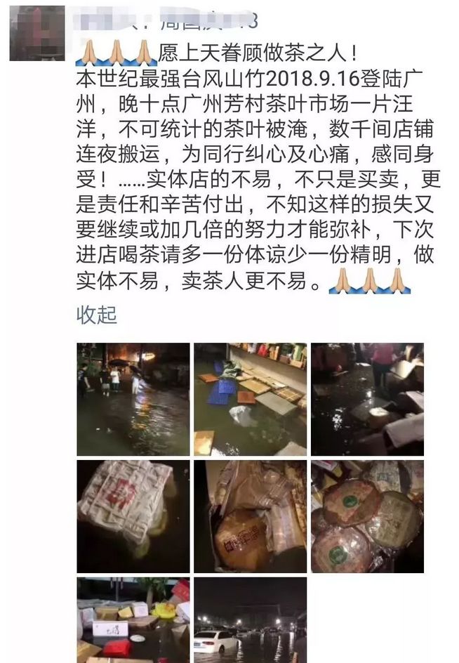 不瞞各位茶友,近幾年廣州芳村就頻發(fā)災(zāi)難。而臺風山竹影響更為強勁,珠江水倒灌,芳村茶葉市場園區(qū)內(nèi)一樓店鋪全部被淹,平均水位超過一米,整個茶葉市場一片狼藉。