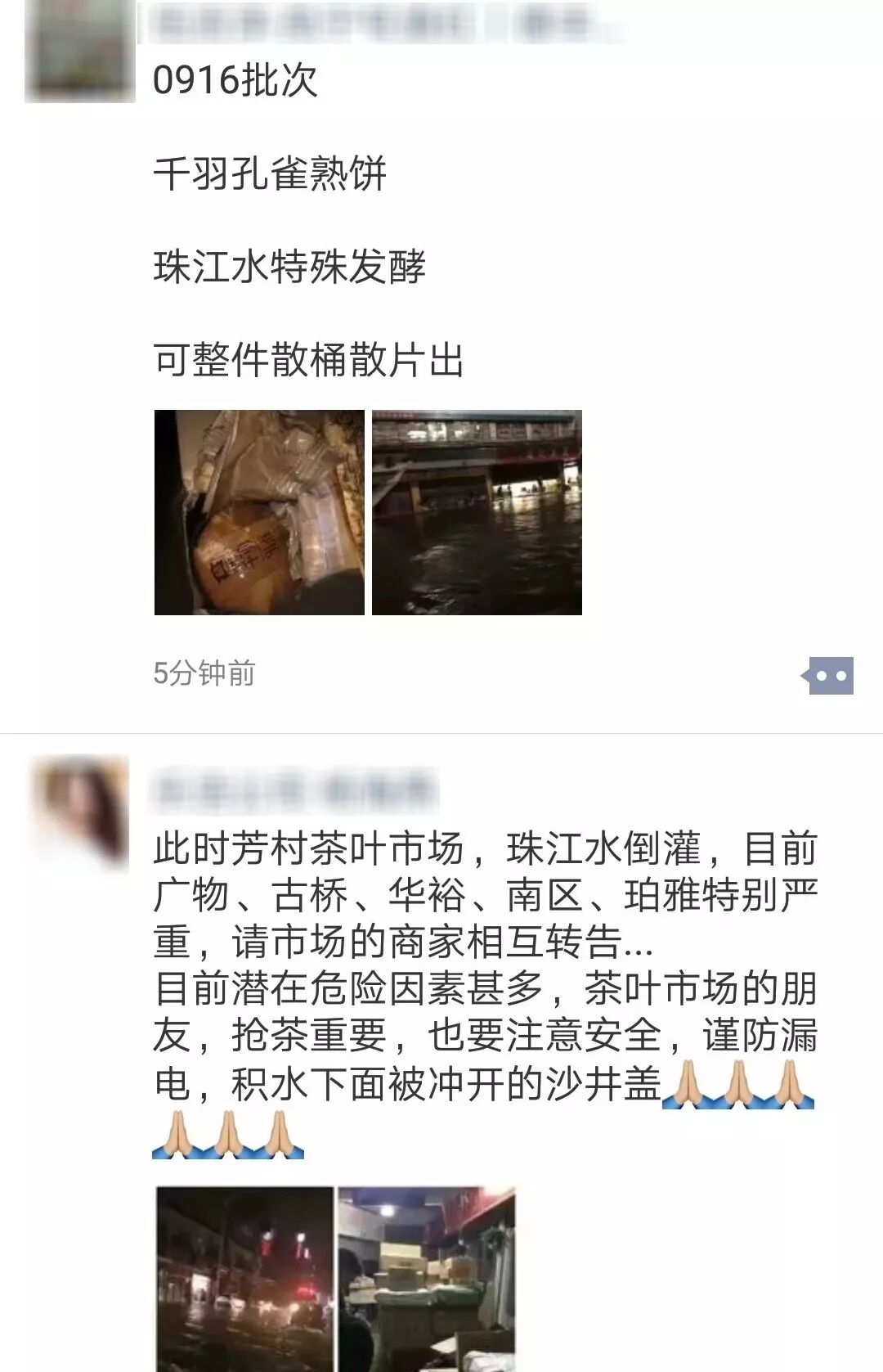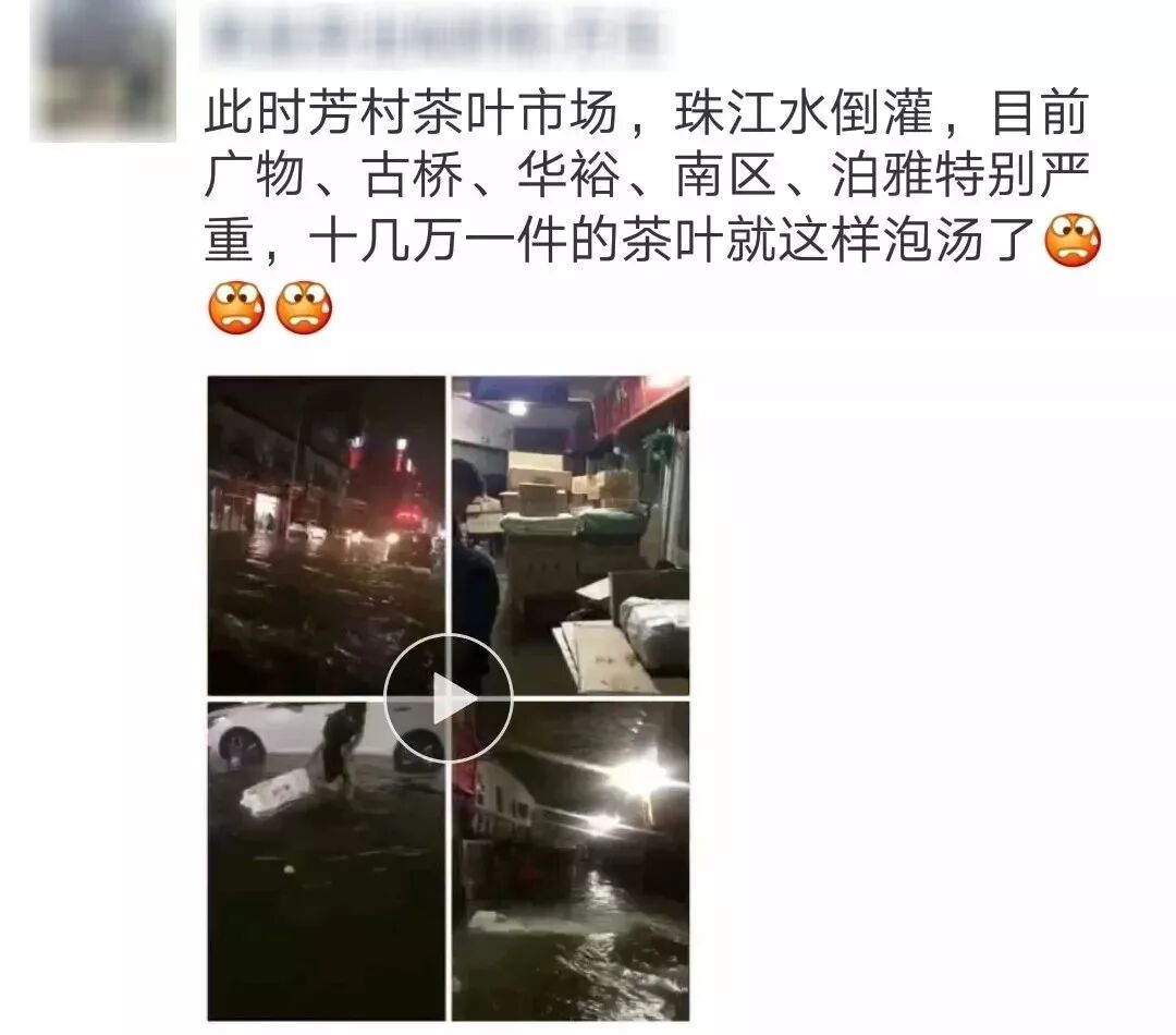9月16日16日17時,芳村茶商接到芳村積水嚴重的緊急通知。商戶開始涉水趕往茶城,減少損失。至晚上11點左右,隨著山竹的遠離,水位才得以緩慢下降,這時候商戶們的朋友圈均是哀鴻遍野。
