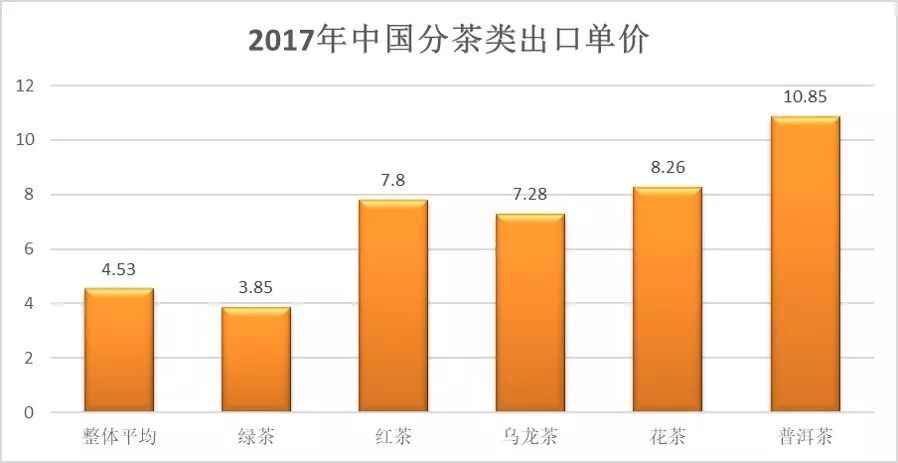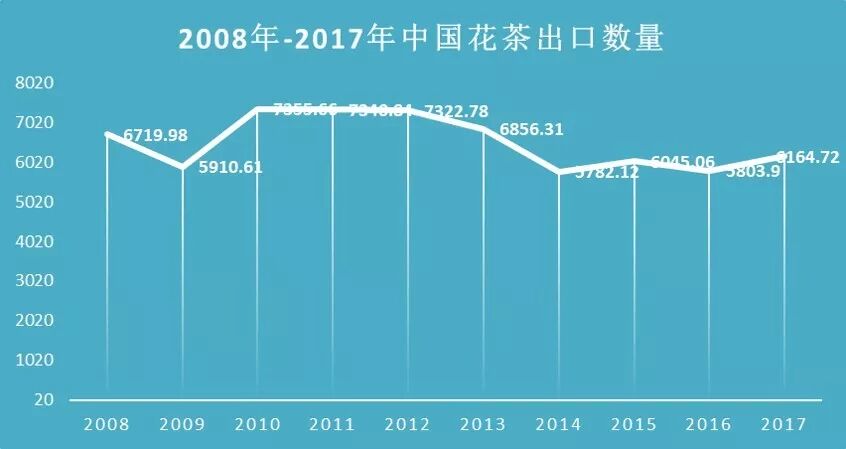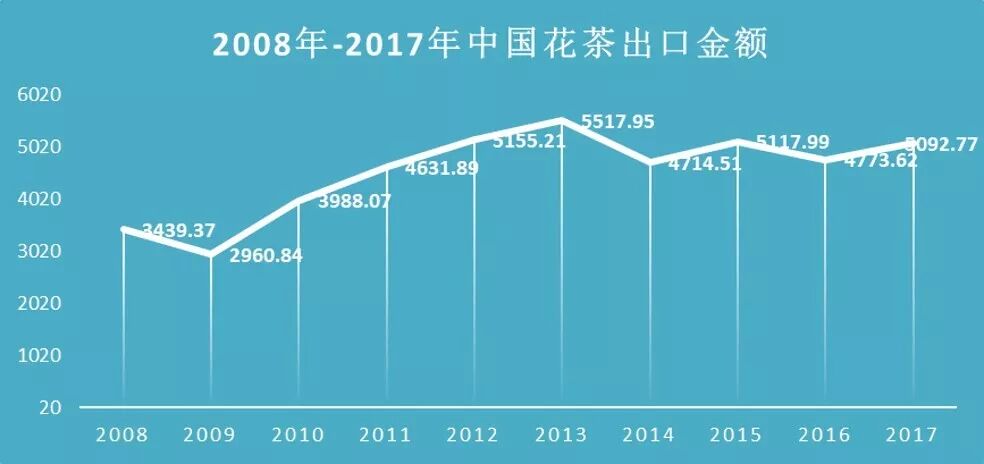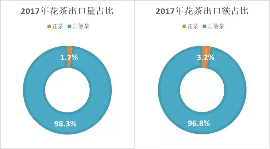 2017年,中國(guó)茶葉出口總量35.53萬(wàn)噸,出口總額16.1億美元,平均單價(jià)4.53美元/公斤。其中,花茶出口數(shù)量6165噸,比增6.1%,占2017年茶葉出口總量的1.75%;出口金額5093萬(wàn)美元,比增6.5%,占總額的3.17%;出口單價(jià)8.26美元/公斤,與2016年基本持平,居各出口茶類的第二位。