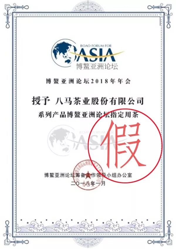 博鰲亞洲論壇秘書處27日發(fā)布通報稱,八馬茶業(yè)股份有限公司在其網(wǎng)站(www.bamatea.com)首頁虛假宣傳其產(chǎn)品為2018博鰲亞洲論壇指定用茶,并在其網(wǎng)站“招商加盟”頁面中使用了一份偽造的博鰲亞洲論壇授權(quán)書。
