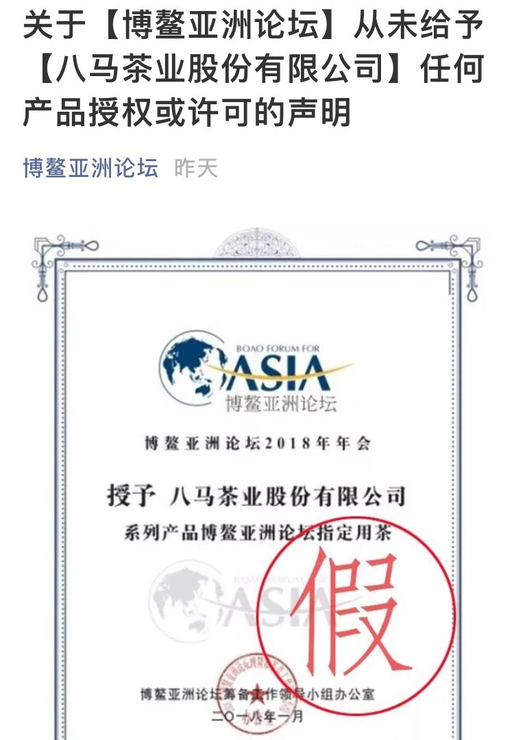 9月27日,博鰲亞洲論壇秘書處發(fā)表聲明稱八馬茶業(yè)股份有限公司在其網(wǎng)站(www.bamatea.com)首頁虛假宣傳其產(chǎn)品為2018博鰲亞洲論壇指定用茶,并在其網(wǎng)站“招商加盟”頁面中使用了一份偽造的博鰲亞洲論壇授權(quán)書。今早,茶周刊就此事件聯(lián)系了八馬方面的負(fù)責(zé)人,并獲得了八馬的最新回應(yīng)。