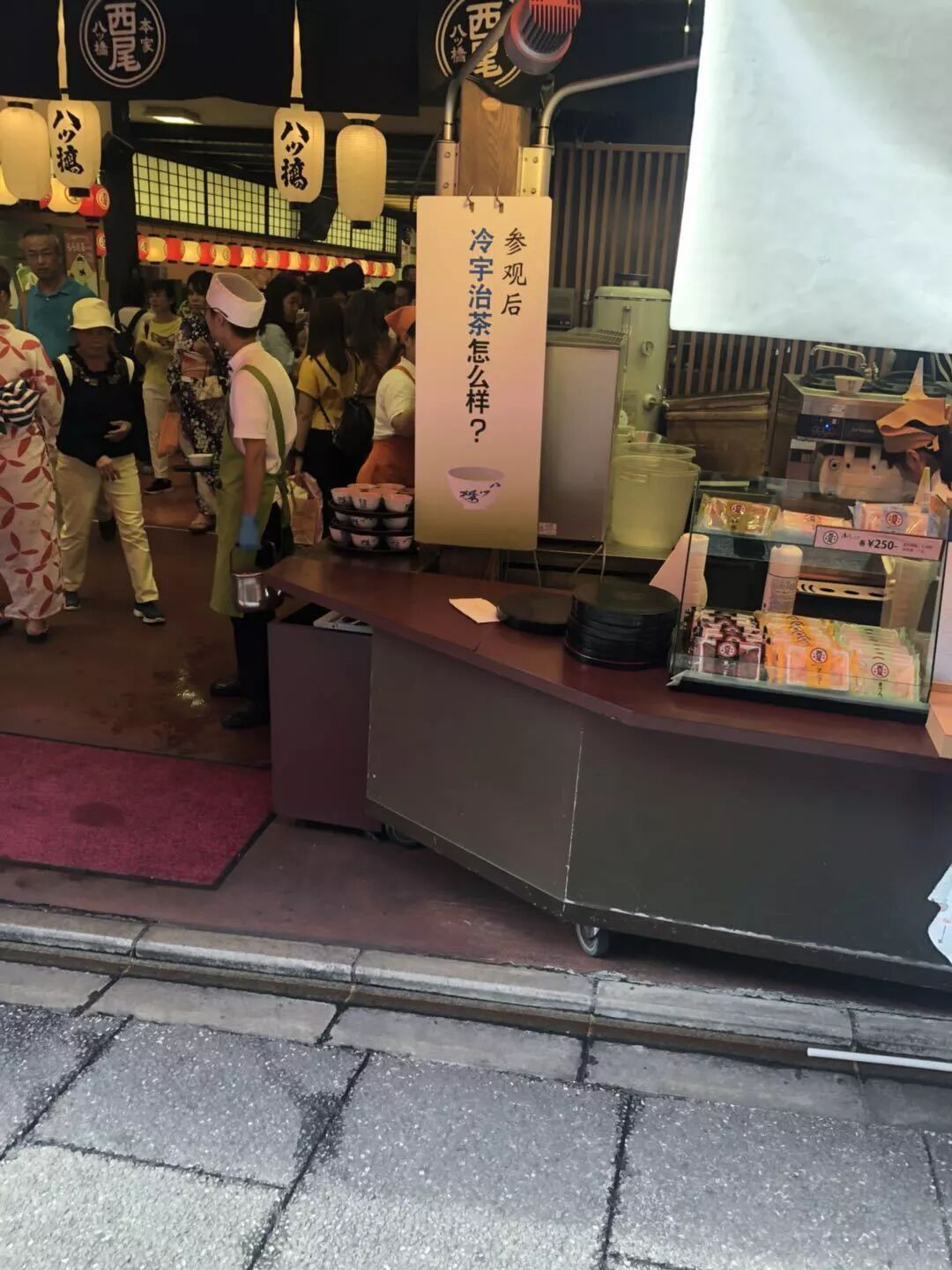 舉個(gè)例子:今年在稻荷神社買了抹茶冰淇淋后,他們會(huì)告訴你買了的話可以到庭院里休息,如果要吃茶點(diǎn)等,就可以進(jìn)去購(gòu)買并休息,同時(shí)可以在他們最好的位置欣賞庭院風(fēng)景。店外則是茶山,門(mén)口有長(zhǎng)凳可以休息。這也是一個(gè)很好的促進(jìn)式的消費(fèi)方式。