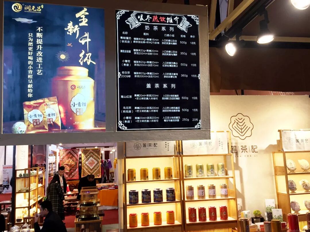 站在展位門外一看“嗯?奶茶店?”走近點仔細看,一罐罐色調明艷的潤元昌小青柑,還有眾多類型的普洱茶精品,便能認出:沒錯,潤元昌好茶就在這啦!