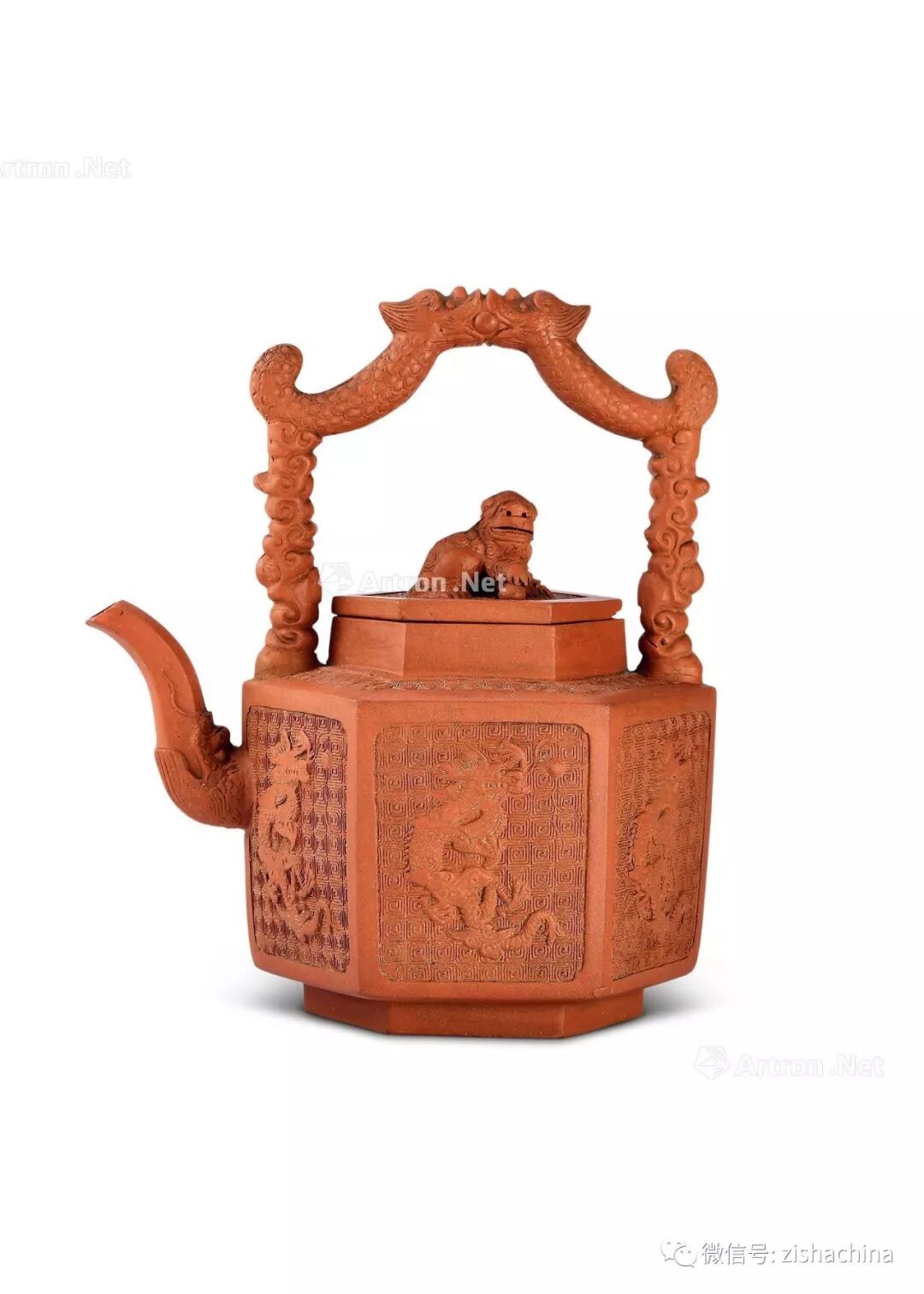 2208 清中期 朱泥貼塑螭龍紋獅鈕蓋壺