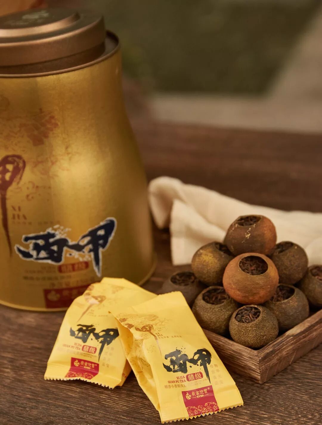 2018年鼎級(jí)西甲小青柑(曬香型),選用新會(huì)核心產(chǎn)區(qū)的西甲柑,配以云南喬木古樹春茶發(fā)酵的10年宮廷小金芽熟普,條索墨黑油亮,具有豐富的蜜香,糅合著小青柑的果味濃香,茶柑相融,分外誘人。