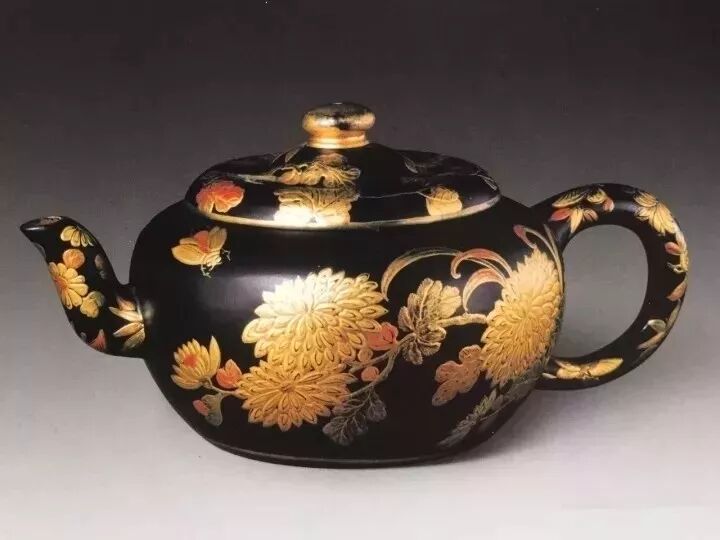 宮廷紫砂器,則是在康熙、乾隆二帝時期,兩朝帝王對紫砂同樣喜愛,多在紫砂上進行琺瑯彩繪、髹漆、描金、泥繪等,多有華麗雍容之感。