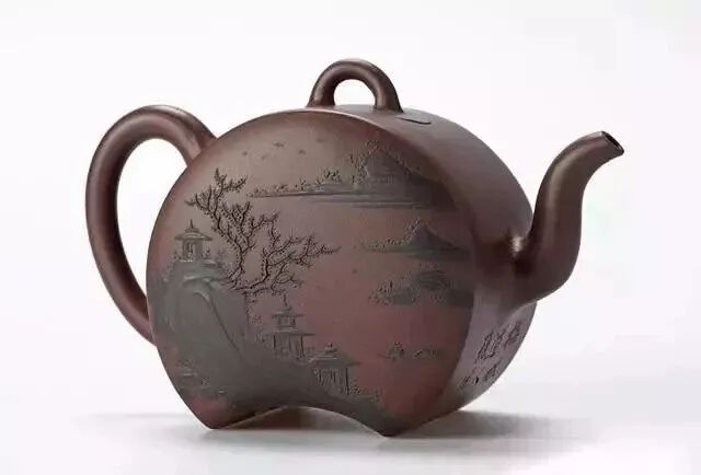 折腹外鼓,嵌蓋碗形鈕,口沿向外延展一條邊線的距離,平底起棱線,呼應(yīng)協(xié)調(diào)。壺把方圓相濟(jì),飾以飛扣,呈螭龍形,最是與眾不同。